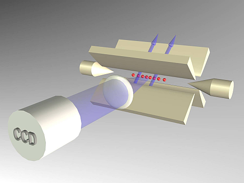 Our group has demonstrated the basic principles of such a quantum computer. Currently, we are working with up to eight ionized Calcium atoms suspended in free space by electromagnetic forces. Each atom represents one quantum bit (qubit). In contrast to classical bits, a qubit can take any value between 0 and 1, so that it contains partially both values at the same time. Due to this property it is possible to calculate an algorithm for both values in parallel. Thus loosely speaking, quantum computers can solve different tasks simultaneously. For certain tasks - like simulation of complicated quantum processes - even a 40-bit quantum computer would be much more powerful than any existing classical computer.