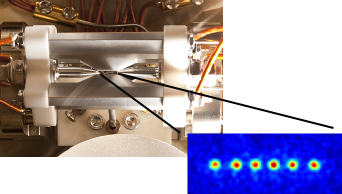 Linear ion trap: By applying voltages to the trap electrodes, a string of ions