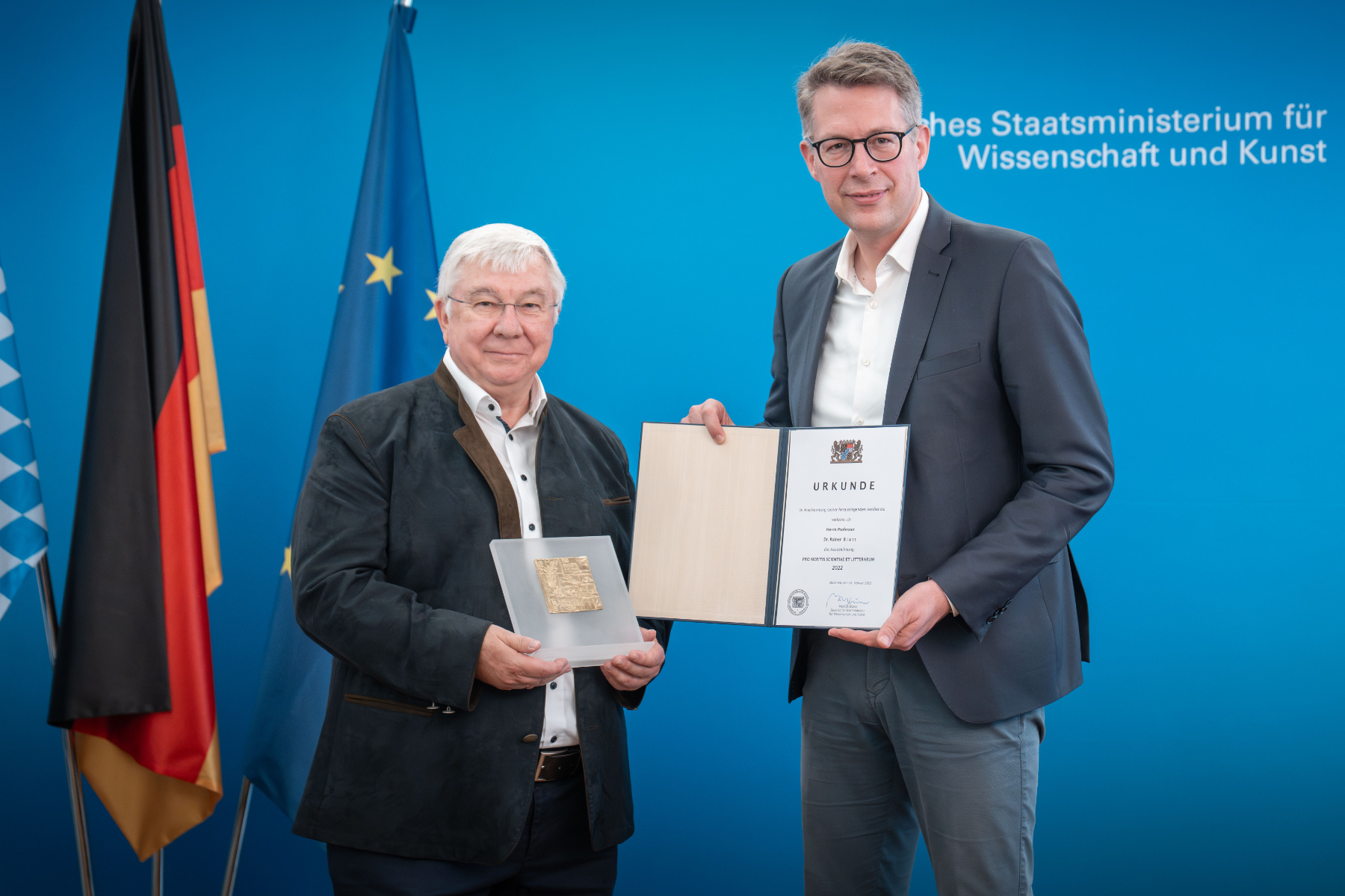 Bavarian State Minister Markus Blume honored experimental physicist Rainer Blatt with the PRO MERITIS SCIENTIAE ET LITTERARUM award for his groundbreaking achievements in the field of quantum optics and quantum information.